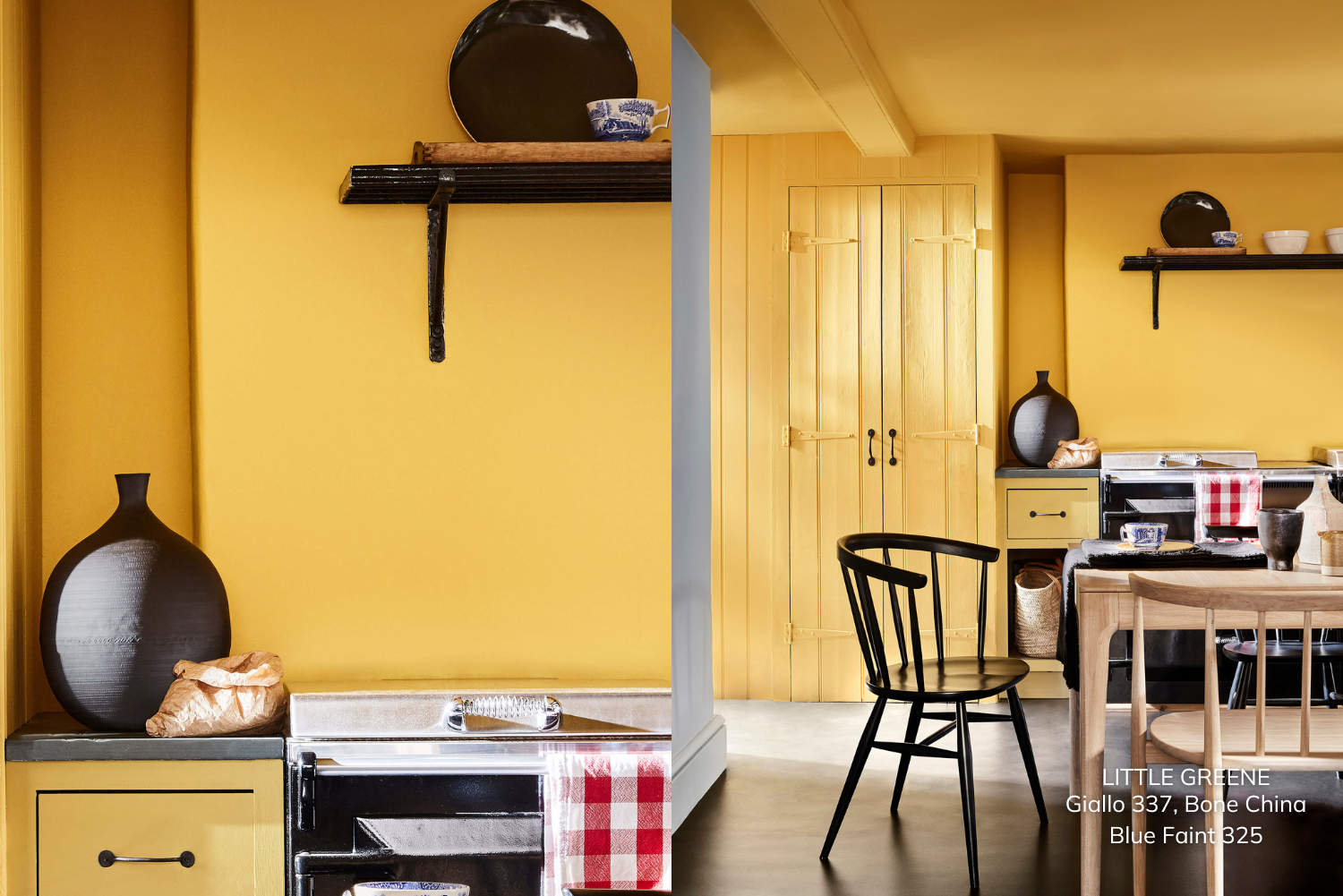 Nothing radiates warmth and joy quite like bold yellow. Pictured here is Giallo 337 from Little Greene with Bone China and blue Faint 325. Paired with deep, moody tones like charcoal or black, it creates a striking balance of energy and sophistication. Use yellow cabinetry or splashbacks to brighten the room, contrasting against dark-stained wood or matte black countertops for an effortlessly contemporary look. This dynamic pairing turns your kitchen into an uplifting yet grounding space.