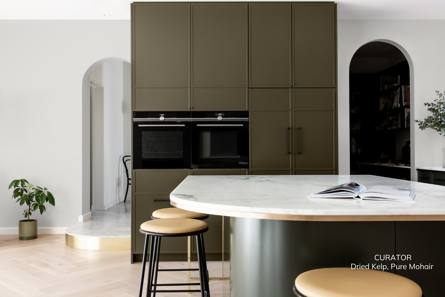 For a timeless, modern aesthetic, the combination of deep, earthy green with soft off-whites is unmatched. Featured in this space are CURATOR's Dried Kelp and Pure Mohair. The green exudes a sense of calm and connection to nature, while the off-white adds a touch of crisp elegance. Opt for green cabinetry or a feature wall, complemented by smooth off-white worktops and minimalistic finishes. The result is a serene and inviting space with subtle luxury at its core.