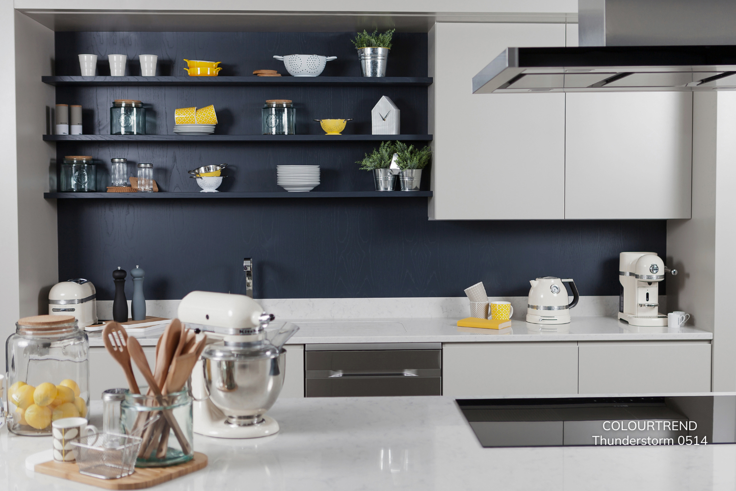 Navy blue and bright white are a classic duo that screams sophistication, but introducing yellow accents elevates this pairing to something truly unique. Picture navy cabinets with gleaming white countertops, punctuated by vibrant yellow bar stools, pendant lighting, or accessories. This combination strikes the perfect balance between timeless and playful, making it ideal for a kitchen that feels alive with personality. Colourtrend pairs their Shade Thunderstorm with white countertops, cabinets and pops of yellow in fun accessories.
