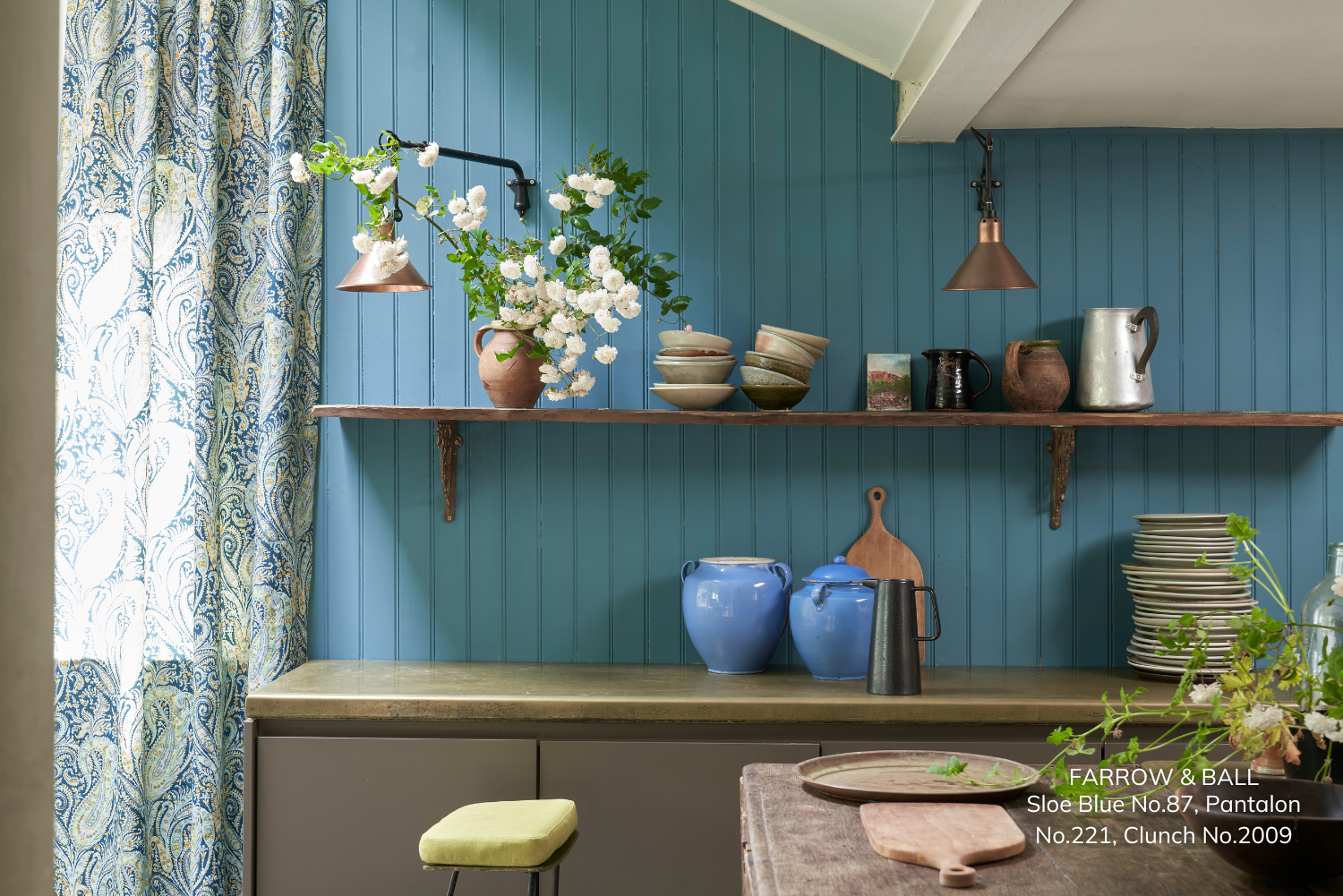 If you love colour but prefer a slightly softer edge, bright blue paired with green-grey tones offers a refreshing and modern choice. Green-grey cabinets and units provide an earthy, grounding feel, paired with a bright and vibrant blue shade the space comes alive. Together, they create a harmonious, vibrant space with a hint of coastal charm—perfect for a kitchen that feels light, airy, and contemporary. Take Farrow & Ball's Sloe Blue No.87 with Pantalon No.221 and Clunch No.2009 for a vibrant twist.